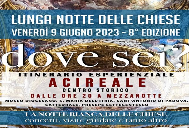 ACIREALE - È giunta all'ottava edizione “La Lunga Notte delle Chiese”, che avrà luogo venerdì 9 giugno 2023, una giornata in cui i luoghi di culto delle città si animano di iniziative artistiche e culturali in una chiave di riflessione e spiritualità. Il tema di quest'anno è "DOVE SEI?". Per la Diocesi di Acireale è la prima "notte bianca" che si comporrà di concerti, esibizioni artistiche, visite museali, iniziative per i bambini, testimonianze, riflessioni e tanto altro. Un mosaico di esperienze da vivere insieme come comunità. L'evento è organizzato in collaborazione con l'Associazione Cento Campanili. Viene proposto un itinerario spirituale nel centro storico di Acireale .