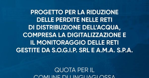 LINGUAGLOSSA - Ammonta a circa 1.700.000 euro la quota destinata al Comune di Linguaglossa nell'ambito del "Progetto per la riduzione delle perdite nelle reti di distribuzione dell'acqua, compresa la digitalizzazione e il monitoraggio delle reti gestite da S.O.G.I.P. S.r.l. e A.M.A. S.p.A", finanziato per un importo complessivo di 18 milioni ...