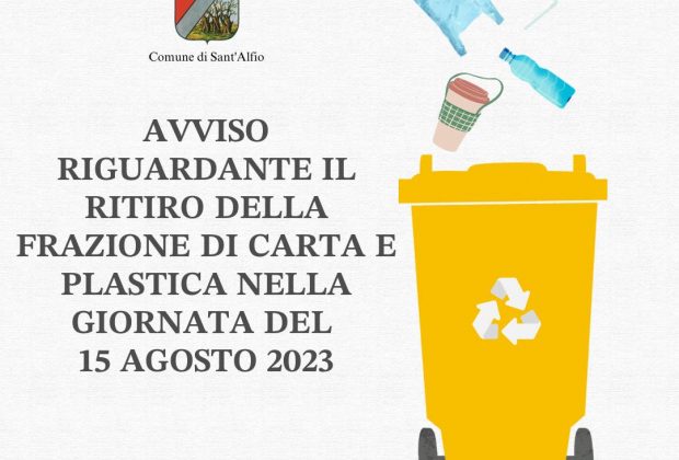 SANT'ALFIO - Il Comune di Sant’Alfio avvisa che, nella giornata del 15 agosto, non verrà svolto il servizio porta a porta della Carta e Plastica. ... -